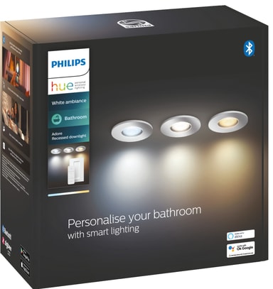 Philips Hue Adore innfelt spotlys 3x5W kommer med tre lyspunkter som kan styres etter hva ditt bad behøver. Bluetooth-appen lar deg enkelt styre belysningen, samt velge mellom et bredt utvalg av lysoppskrifter.Les mer om produktet