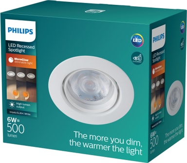 Philips Impala Ceiling spotlys 6W er en stilig lysløsning til huset eller leiligheten din. Den innfelte taklampen har justerbar dimming, samtidig som den beholder lysstyrken og gir deg et behagelig stemningsfullt gult lys.Les mer om produktet