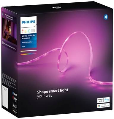 Philips Hue Solo lysstripe 20W er en 10 meter lang lysstripe som er ideell for lange flater. Den er designet for enkelhet og fleksibilitet, og gir et indirekte, diffust lys som forbedrer interiøret i rommet. I tillegg kan den kobles til en Hue Bridge og styres via en smarttelefon.