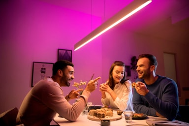 Oppnå en perfekt atmosfære ved å bruke belysning fra Philips Hue Ensis pendellampe, med et integrert LED-lys som kan styres via Philips Hue-appen. Velg den riktige fargen, dim lyset eller dra nytte av stemmekontroller for å oppnå en behagelig stemning i ditt hjem.