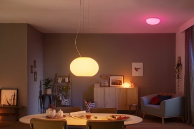 Philips Hue Flourish pendellampe 24V med ulike nyanser av hvitt lys og 16 millioner farger hjelper deg med å finne den perfekte atmosfæren til enhver situasjon. Du kan enkelt justere fargetemperaturen fra varmt til kjølig hvitt lys, dempe lysene eller velge fra 16 millioner farger, alt ved hjelp av Philips Hue-appen.