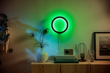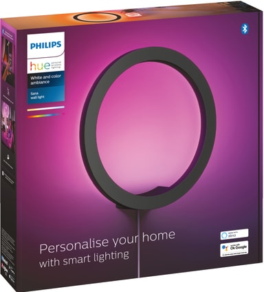 Med Philips Hue Sana vegglampe kan du lage lyseffekter til enhver anledning. Lampen har RGB-farger, varmt til kjølig hvitt lys, dimbar funksjon og kan enkelt kontrolleres via Philips Hue-appen.Les mer om produktet