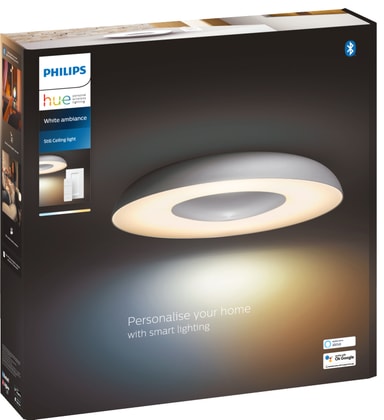 Den stilige Philips Hue Still taklampe har et spesielt rundt design som vil hjelpe deg med å skape en hyggelig atmosfære i ditt hjem, slik at du kan gjøre dine daglige aktiviteter i perfekte lysforhold. Lampen er dimbar og kan styres med Philips Hue-appen på din smarttelefon, bærbare PC eller nettbrett. Du kan også bruke dimmebryteren som er inkludert i pakken.