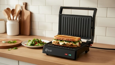 Equip panini-pressen kombinerer funksjonalitet med stil på elegant og kompakt vis. Det moderne utseendet passer inn på enhver kjøkkenbenk, mens det kjølige håndtaket og de sklisikre føttene gir både komfort og stabilitet under bruk.