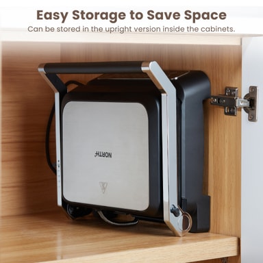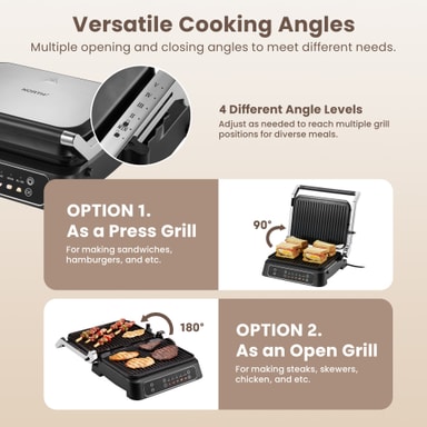 Denne grillen har et 180° åpent design for allsidig matlaging. Det justerbare, flytende hengslet kan håndtere ulike matvarestørrelser, mens håndtaket med kjølig berøring sørger for sikker håndtering.