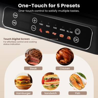 Separate temperaturkontroller for øvre og nedre plate gjør at du kan tilpasse varmenivåene for optimal tilberedning, noe som gir deg perfekte grillresultater.