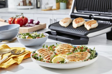 Bordgrillen tilbyr ni automatiske matlagingsprogrammer, slik at du kan tilberede ulike retter som burger, kylling, panini, pølser, biff, fisk, sjømat, svin og bacon. Den manuelle modusen gir fire ulike temperaturmuligheter, ideellt for å grille frukt og grønt.