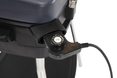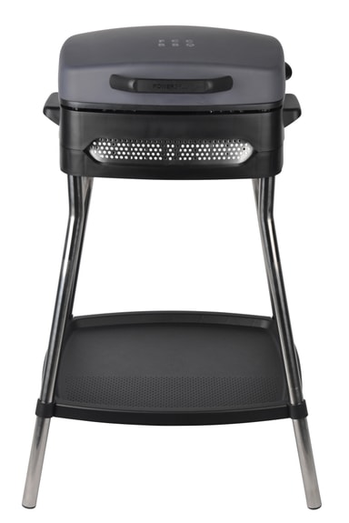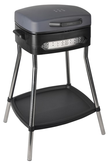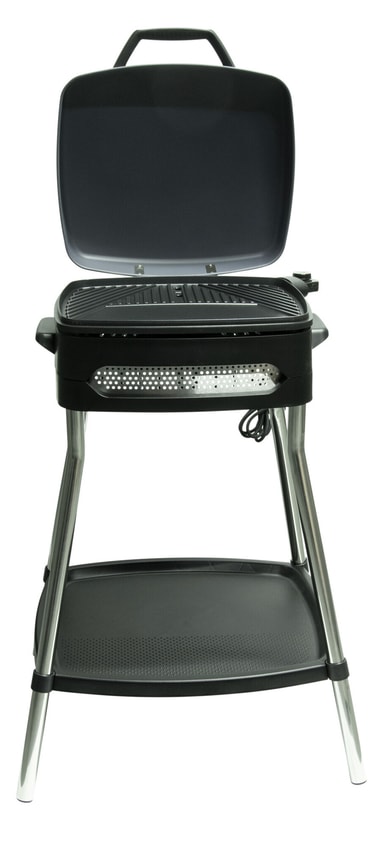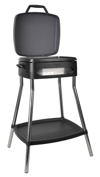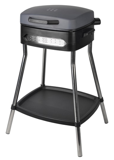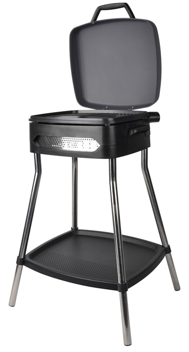 Denne grillen er svært allsidig. Du kan bruke den som tradisjonell grill på stativ, eller ta av toppen og bruke den som bordgrill. Den kommer utstyrt med en romslig non-stick grilloverflate av støpt aluminium på 40 x 36 cm og et stativ med en dedikert utstyrshylle.