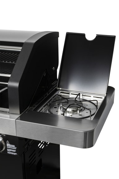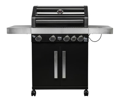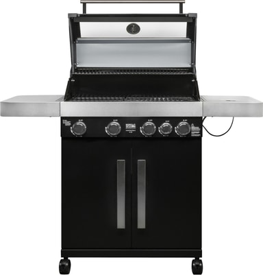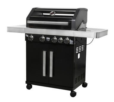 Grillen har dobbeltisolert lokk med vindu og termometer , 4 stk brennere i stainless steel (#304), Integrert tenning, emaljert grillrom og flammetemmere, grillrister i matt emaljert støpejern, MGS-system for variert grilling, varmehylle, store sidebord med 1 sidebrenner, Understell med skap for oppbevaring og 4 hjul. Grillflate 73,5x45cm + varmehylle. Montert str: 138x60x116cm. Effekt: 17kW. For enkel montering og gode tips, scan QR kode i manualen og følg instruksjonsvideo steg for steg.