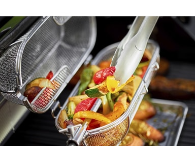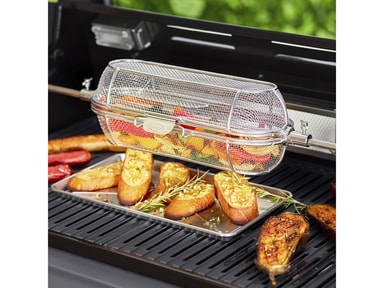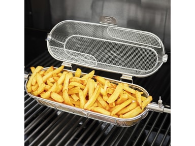 Kurv til montering på Rösle-rotisseri. Med en rotisserikurv kan du enkelt lage alt fra sprø pommes frites og møre grønnsaker til saftige skalldyr og deilig popkorn på grillenLes mer om produktet