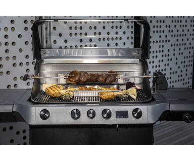 Rotisseri med omtrent tre omdreininger per minutt, som sikrer sprøtt kjøtt på utsiden og saftig inni. Det solide spydet i rustfritt stål tåler opptil 10 kg og er utstyrt med fire holdere for sikker festing av kjøttetLes mer om produktet