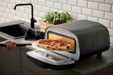 Egnet for både innendørs og utendørs bruk, og med et stilrent rundt design, trippelisolert glassdør og et innebygd lys, er ovnen like god tilå lage pizza som den er til å tilføre kjøkkenet eller hagen din et stilrent uttrykk.