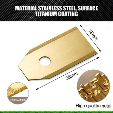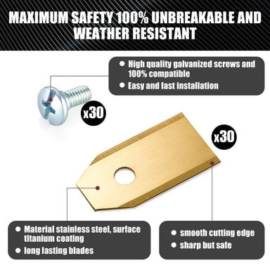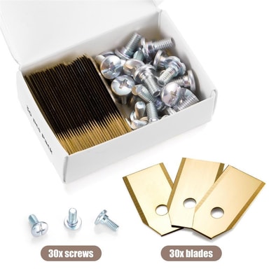 Hvis du verdsetter en plen som alltid er velstelt, er vårt sett med 30 titanblader det riktige valget! De utvalgte materialene (rustfritt stål og titan) garanterer perfekt klippearbeid. De er værbestandige, rustbestandige, slitesterke og spesielt skarpe. Bladene festes enkelt til roboten ved hjelp av de medfølgende skruene - Pakke med 30 kniver og tilhørende skruer - Høykvalitets rustfritt stål med titanbelegg - Kun 0,75 mm tynt - Dobbeltsidig og ekstra skarp Dra nytte av en rent klippet plen takket være disse sylskarpe bladene !