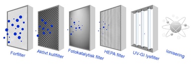 • UV-GI lysfilter som uskadeliggjør virus og bakterier