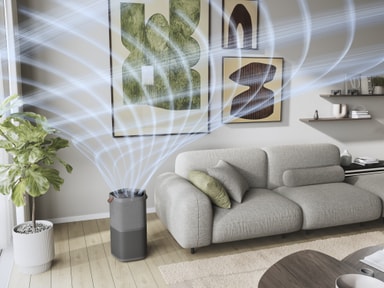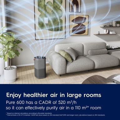 Perfekt for store rom: Med en CADR på 5201, renser Pure 600 luften i et 108 kvm2 rom på mindre enn 4,24 minutter, takket være den spiralformede luftstrømmen i det kraftige AirSurround-systemet. Et aktivert kullfilter nøytraliserer formaldehyd og andre VOC-er.