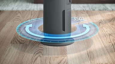 Luftrenseren har en ren lufttilførselshastighet (CADR) på 270 m³/t og 350 graders luftstrøm som sikrer grundig sirkulasjon til hvert hjørne av rommet.