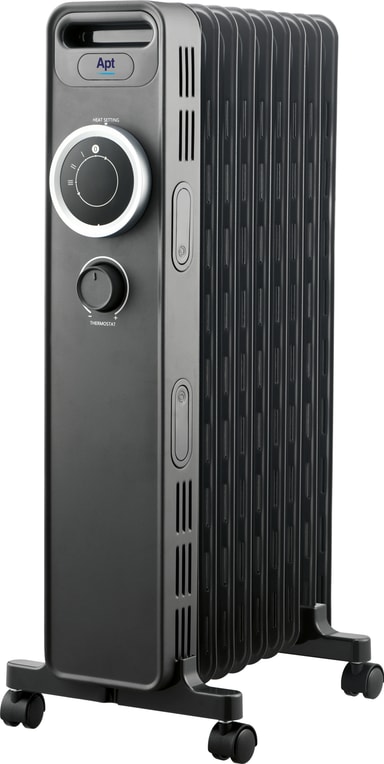 Apt Therma oljeradiator 2000W gir jevn, stillegående varme med 9 lameller for effektiv romoppvarming. Den har 3 effektnivåer, justerbar termostat, velte- og overopphetingsbeskyttelse, samt ledningsoppbevaring for et trygt og praktisk design.Les mer om produktet