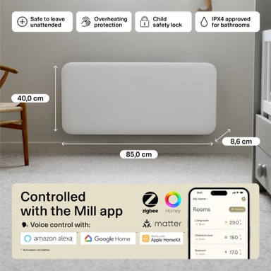 Mill Invisible Smart Wi-Fi Gen4 panelovn PA1000WIFI4 er en elegant varmeovn. Den er KI-kompatibel og støttes av ulike smarthjem-plattformer som Matter, Zigbee 3.0 osv. Den er ideell for rom på 12–16 m² og kan med IPX4 også brukes i våtrom.Les mer om produktet