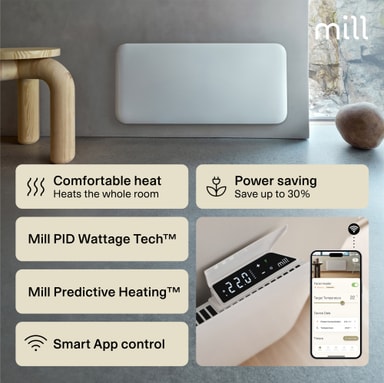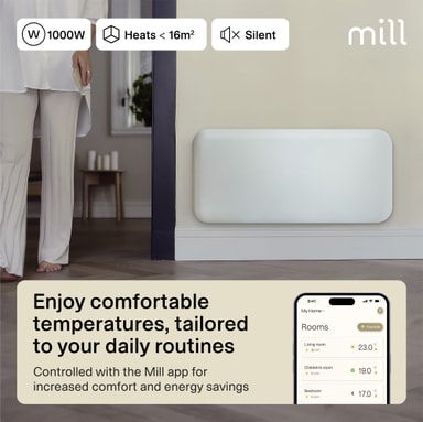 Styr temperaturen i hjemmet ditt med Mill Invisible Smart Wi-Fi Gen4 panelovn PA1000WIFI4, ideell for rom på 12–16 m². Den støtter Matter, Zigbee 3.0 og WiFi, og har funksjoner som Mill Predictive Heating og Mill PID Wattage Tech, som tilpasser seg dine bruksvaner for optimal komfort.