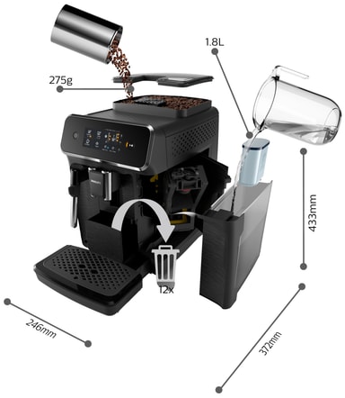 Slapp av med en deilig kopp kaffe og nyt dens høye kvalitet takket være den helautomatiske Philips kaffemaskinen EP2220/10. Kaffen kan tilberedes slik du ønsker ved hjelp av My Coffee Choice-funksjonen, og liker du å ha kaffegjester, vil det glede deg å vite at du kan tilberede to kopper kaffe samtidig. kaffemaskinen er videre utstyrt med en klassisk melkeskummer som vil dekorere din cappuccino eller latte med kremete skum.