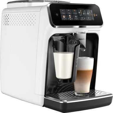 Med denne kaffemaskinen fra Philips får du en helautomatisk maskin som leverer perfekt kaffe med ett enkelt trykk. Her kan du velge mellom klassiske drikker som espresso, cappuccino og latte, og i tillegg nyte det silkemyke melkeskummet som LatteGo-systemet gir deg. Maskinen har et veldig intuitivt touchdisplay, en aromabevarende kvern, og du har også mulighet for å legge inn personlige innstillinger – for å nyte kaffekoppen, akkurat slik du liker den.