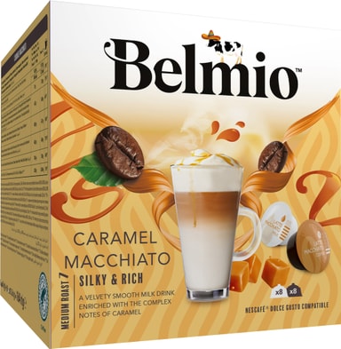 Belmio Caramel Macchiato kaffekapsler for Dolce Gusto blander førsteklasses Arabica- og Robusta-kaffe med glatt melk med karamellsmak. Perfekt for en søt start på dagen eller en avslappende ettermiddagspause.Les mer om produktet
