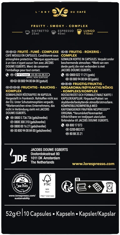 L'Or Lungo Estremo kapsler LOR4028607 laget av L'Or Coffee Artists gir deg gleden av en fruktig og røkt kaffekopp med et lite hint av vanilje. Dette er en 10-intensitets kaffe og disse aluminiumskapslene er kompatible med kaffemaskiner fra Nespresso*.