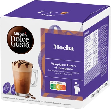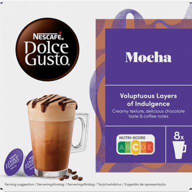 NESCAFÉ Dolce Gusto Mocha Coffee-kapsler, vår kremete og søte sjokolade med et hint av premium Arabica-kaffe. En kombinasjon av deilige kakaotoner med kremet melk og et snev av fine aromatiske kaffetoner.Les mer om produktet