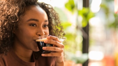 Kvinne nyter Senseo kaffe laget av en Senseo-kapselmaskin