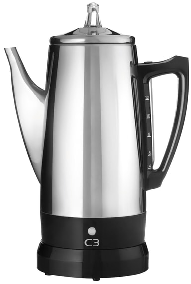 Denne stilfulle perkulatoren fra C3 brygger 4-12 kopper sterk kaffe på minimalt av tid. Kaffen holder seg varm i inntil en time etter automatisk avstengning.Les mer om produktet