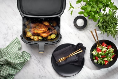 Airfryeren har et kompakt sort matt ytre med en kurv på 8 liter, som også har et håndtak. Kapasitetn gjør den godt egnet til å tilberede måltider for familier eller større anledninger.