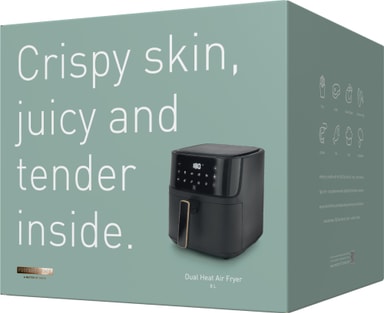 F&B Digital Dual Heat airfryer 8L har en kapasitet på 8l, effekt på 2000W, og har åtte forhåndsinnstilte programmer for steking, grilling, og baking. LED-touchdisplayet lar deg justere temperaturen og tidsinnstillingene.Les mer om produktet