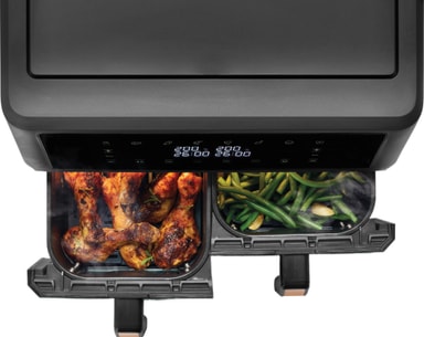 Airfryeren har et kompakt sort matt ytre med to kurver på 5,5 liter, som kan brukes samtidig for en kapasitet på elleve liter. Hver kurv har et eget håndtak for ekstra bekvemmelighet.
