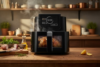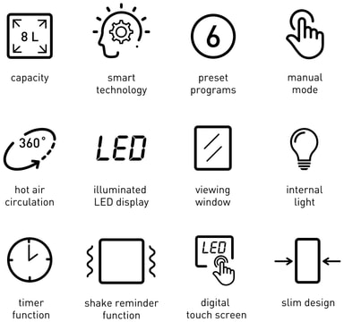F&B Slim Smart airfryer 75720 på 1700 W har en kapasitet på 8L og er utstyrt med en ekstra stor kurv med gjennomsiktig vindu for enkel overvåking. Den har justerbar temperatur opptil 200°C, seks touchinnstillinger og barnesikret kurv.Les mer om produktet