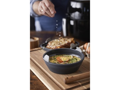 Den runde silikonformen passer perfekt i airfryeren. Du unngår klissete og brente matrester i airfryeren, og silikonformen vaskes enkelt for hånd eller i oppvaskmaskinenLes mer om produktet