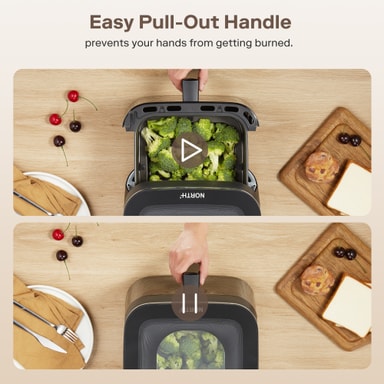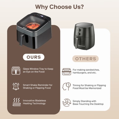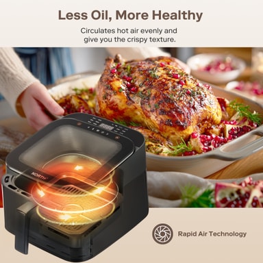 Airfryeren bruker en vifteløs varmluftsirkulasjonsfunksjon i stedet for varmevifter, og fordeler varmen jevnt over hele interiøret for jevn matlaging og en gyllen stekekant.