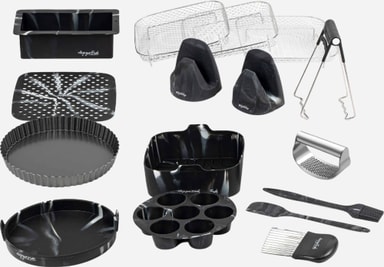 Panetti Trude tilbehør til airfryer AIRTRU13PPAN består av 13 LFGB-sertifiserte gjenstander laget av varig silikon og metall, perfekt for airfryere med størrelse 5,5 liter eller større. Hver gjenstand kan vaskes i oppvaskmaskin, for enkel rengjøring.Les mer om produktet