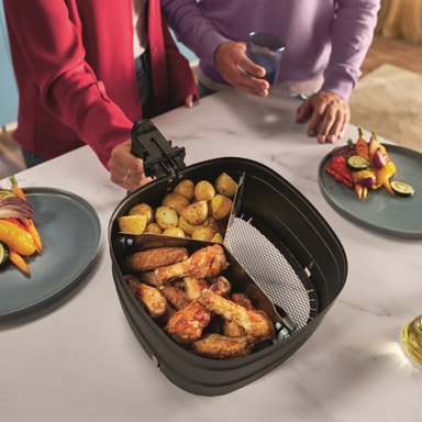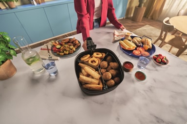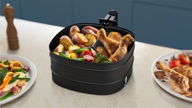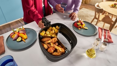 Tilbered et helt måltid samtidig med separate rom for hovedretter og tilbehør. Dette maksimerer airfryerens kapasitet uten å blande ingredienser.