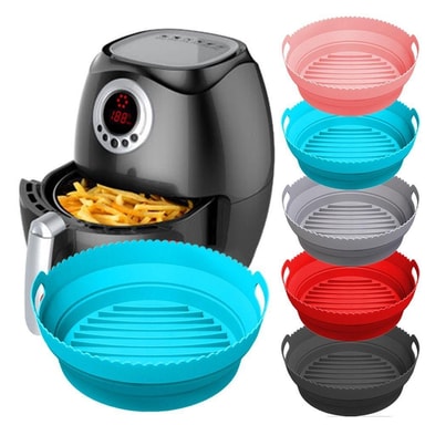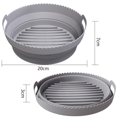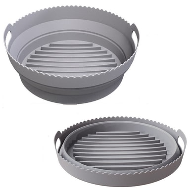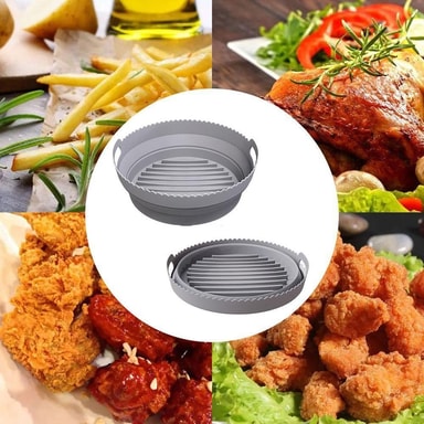 Rund form av matgodkjent silikon. Den passer perfekt inn i frityrkokeren og forhindrer klebrige og brente matrester i Air Fryer. Beholderen er gjenbrukbar og kan vaskes i oppvaskmaskin. Den hevede kanten holder maten på plass og fanger opp smuler og overflødig fett. Formen kan komprimeres slik at den tar mindre plass når den ikke er i bruk.
