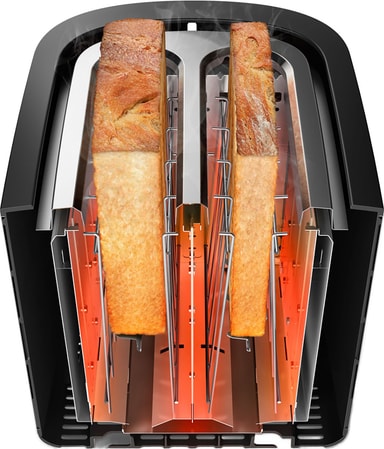 Brødristeren bruker 950 watt og kan varme opp ferske og frosne brødskiver.