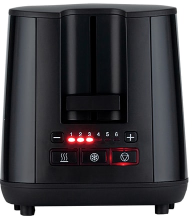 Denne brødristeren har 1000 W varmeelement og digital kontroll for rask og effektiv tilberedning av ristet brød. Du kan stille inn temperaturen på seks forskjellige nivåer for å passe til den gylne fargen du foretrekker. For mer bekvemmelighet er det en funksjon for oppvarming, tining og avbryting.
