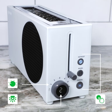 Spis en god frokost med Xbox Series S brødrister 18083. Den trykker Xbox-logoen på opptil to store brødskiver og sørger for en mer underholdene og velsmakende frokost. Med seks bruningsnivåer, timer, tining og bagelfunksjon får du ikke bare et kult apparat, men også deilig varmt brød.