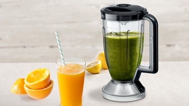 En bolle med en kapasitet på 3,9 liter kan romme opptil 1,5 kg deig. Med den høykvalitets Tritan-blenderen på 1,5 liter kan du enkelt lage smoothies og cocktails helt uten klumper eller biter.