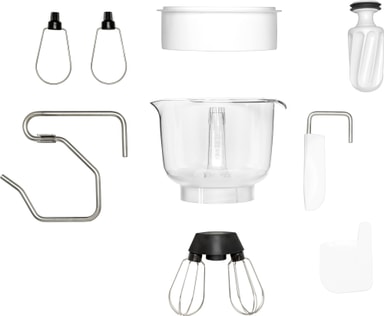 Takket være et stort utvalgt av tilgjengelige tilbehør, som kjøttkvern, skiver, deigkrok, sitruspresse og pastaruller, blir kjøkkenmaskinen til et apparat som kan brukes til alle mulige kjøkkenformål.