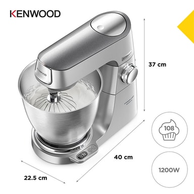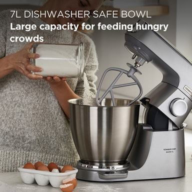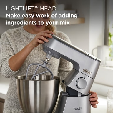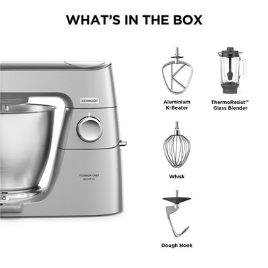 Kenwood Titanium Chef Baker XL er en kraftig kjøkkenmaskin på 1200 W med en 7 liters skål, innebygd EasyWeigh-vekt og ThermoResist-blender. Den leverer presis planetarisk miksing, støtter mer enn 25 tilbehør og leveres med 10 års motorgaranti.Les mer om produktet