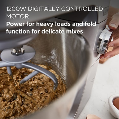 Denne kjøkkenmaskinen har en kapasitet på 1200 watt og leveres med en 7-liters blandebolle i rustfritt stål, en klar sprutbeskyttelse med påfyllingsklaff og slitesterke, lettmonterte verktøy i rustfritt stål.