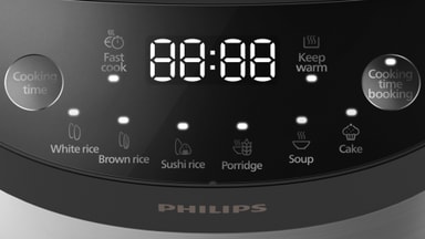 Philips 3000 Series riskoker HD3093/80 på 600 watt har åtte tilberedningsprogrammer og plass til 0,85 liter ukokt ris (2,5 liter kokt). Den koker ris på bare 30 minutter, har et nonstick-belegg for enkel rengjøring og en hold varm-funksjon som holder risen klar til å spises.
