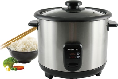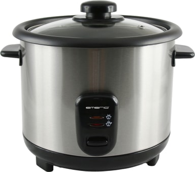 Emerio Riskoker Rustfri 1,5l Riskoker med flott design med en kapasitet på 1,5 liter. Riskokeren slår seg av automatisk. Effekt på 500W gjør at pannen blir fort varm og risen kokt raskt og perfekt. - Innehold: 1,5 L - Rustfritt deksel - Innerpanne med non-stick belegg - Avtagbar innerpanne - Holde-varm funksjon - Beskyttels mot tørrkoking - Skje medfølger - Vannmål - Anti-skli føtter - Strømindikeringslampe - Effekt: 500 Watt