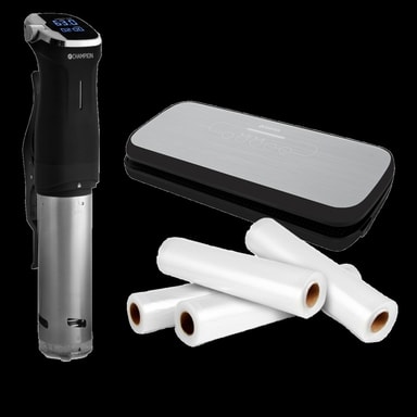 Vi har satt sammen en pakke med alt du trenger for å prøve å tilberede maten din med Sous Vide. Champion Champion Champion Pakken inneholder en Sous Vide Precision Circulator, vakuumpakker Fresh og vakuumposer i rulleformat. Dette er alt du trenger for å lykkes med din ""Sous Vide"" første gang.