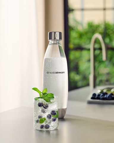 BPA-frie SodaStream Fuse DWS kullsyreflaske 1741199770 er klar til å oppbevare forfriskende hjemmelagde brusen din i mange år fremover, med en bunn i rustfritt stål og en hermetisk lukket kork som sikrer at den er holdbar og tåler oppvaskmaskin.Les mer om produktet